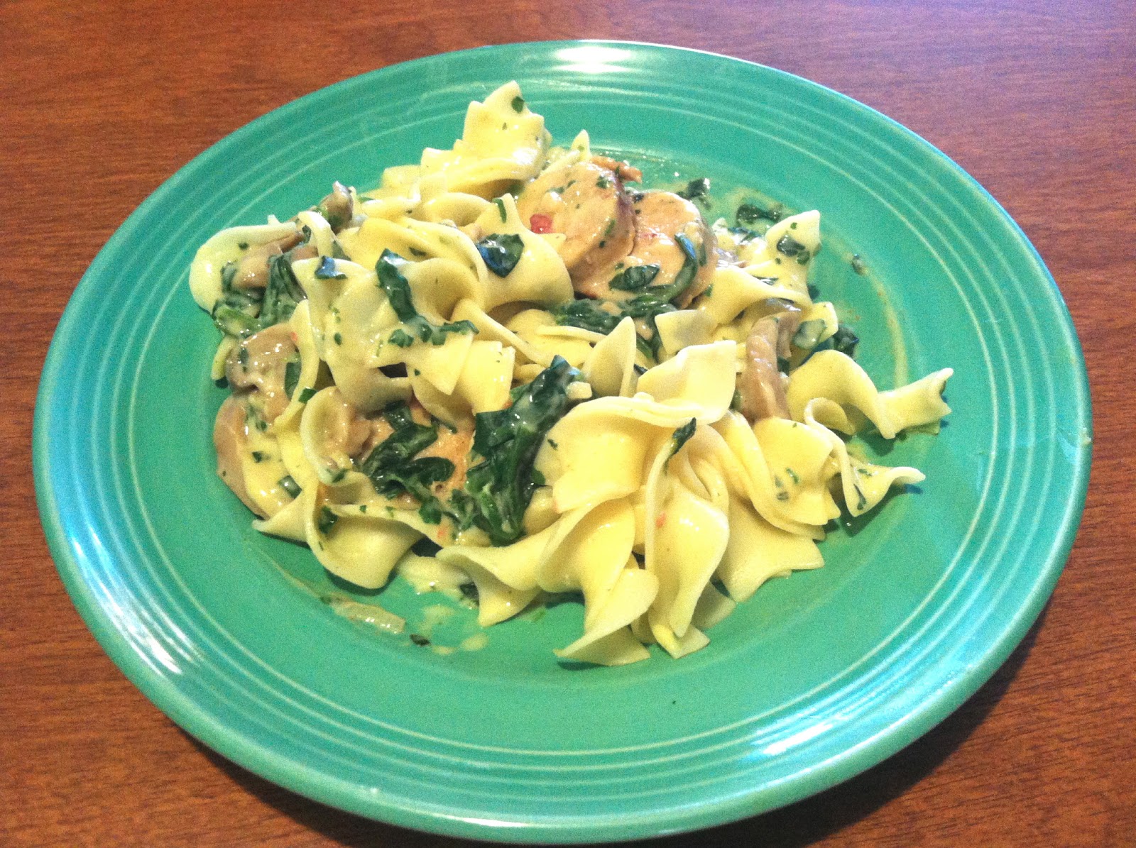 In a medium sauce pan, cook noodles as directed. While noodles are cooking combine all other ingredients in a separate pan on the stove top on Medium. Continue stirring sauce until heated through and flavors seem to be combined (5-7 min). After noodles are finished cooking, drain and combine with sauce. Now, you're ready to eat!
